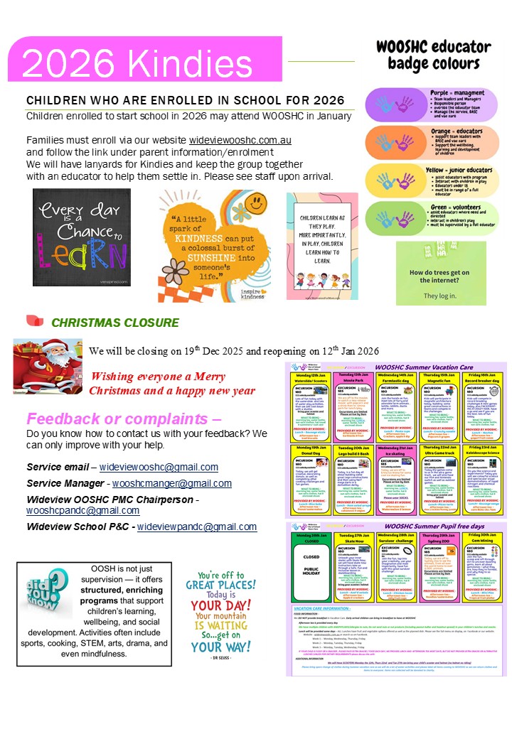 WOOSHC utilises the tennis courts, cricket pitch, library, outdoor equipment and other sporting and outdoor areas by agreement with Wideview Public School.