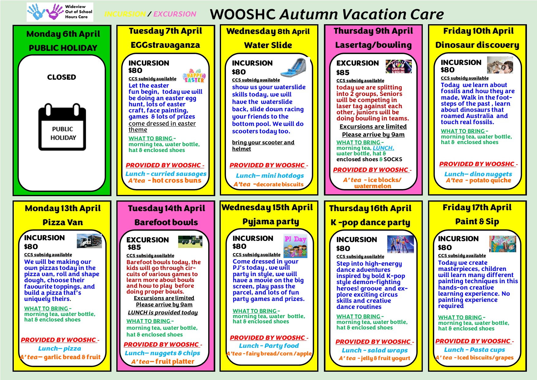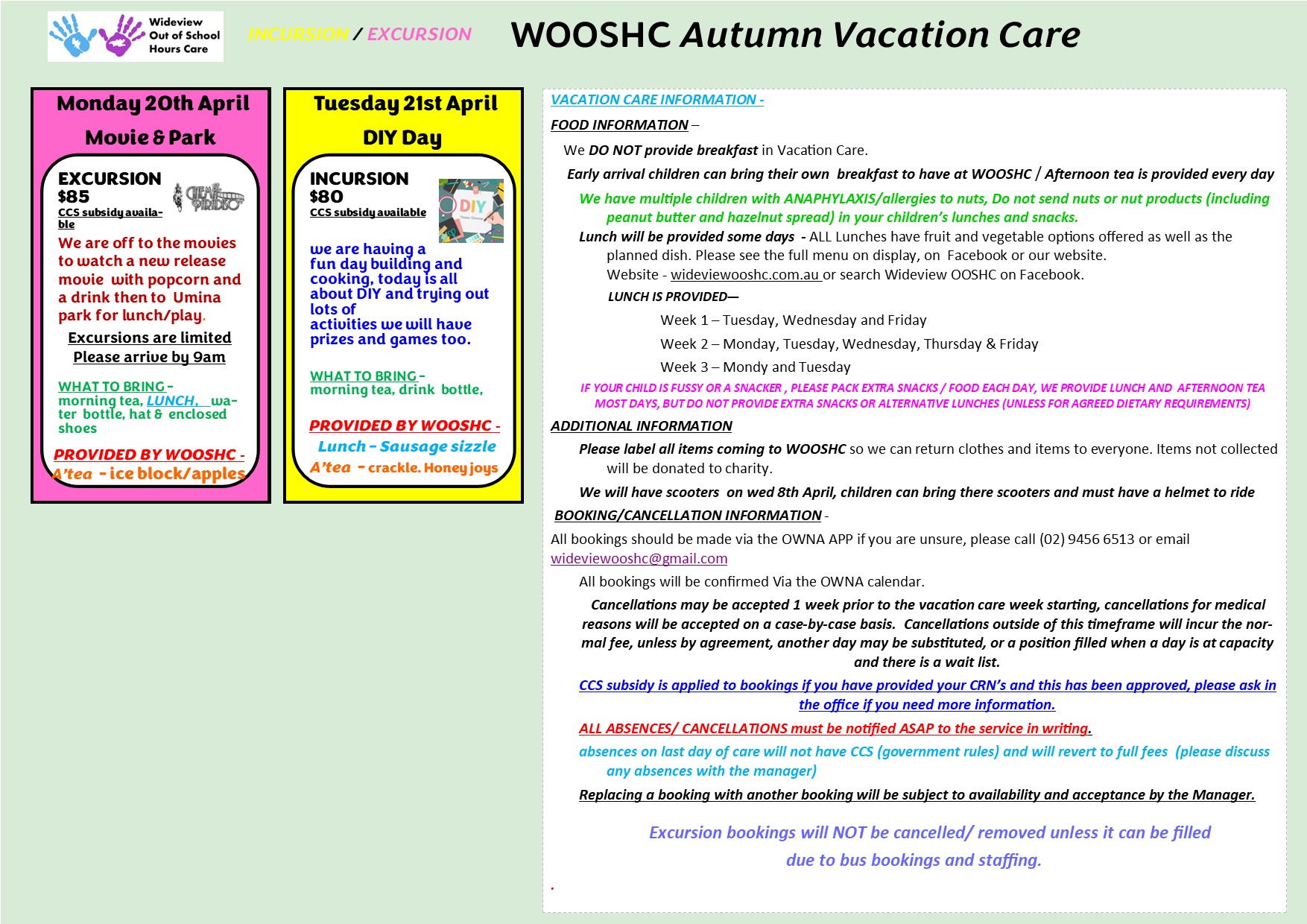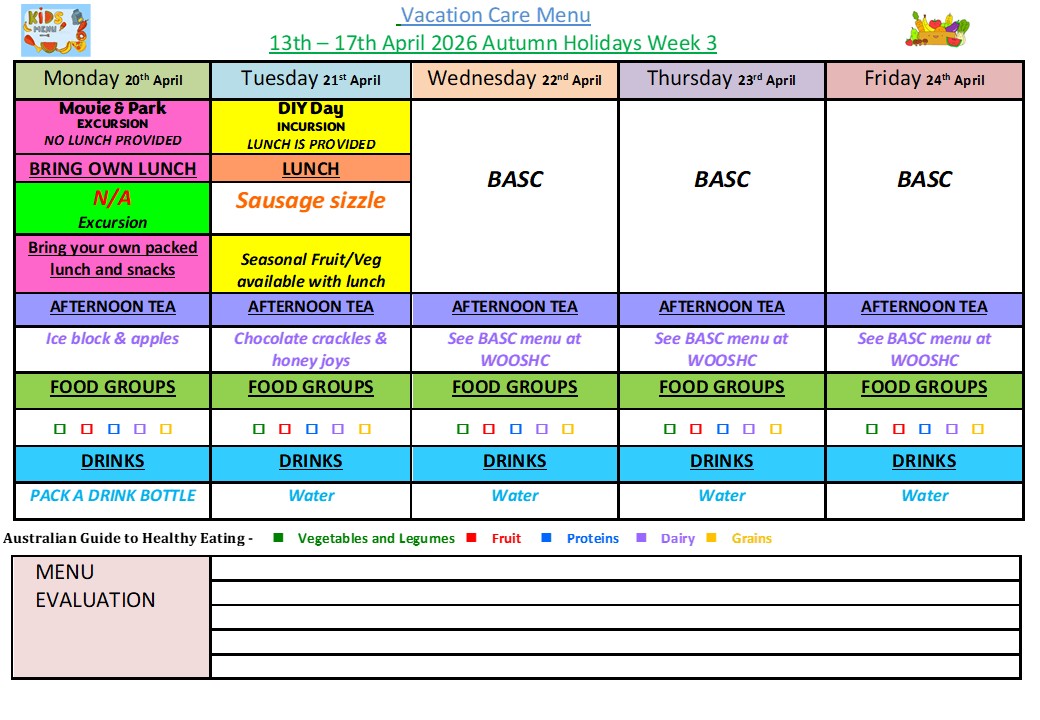 WOOSHC is open for Vacation each school holiday Period.
